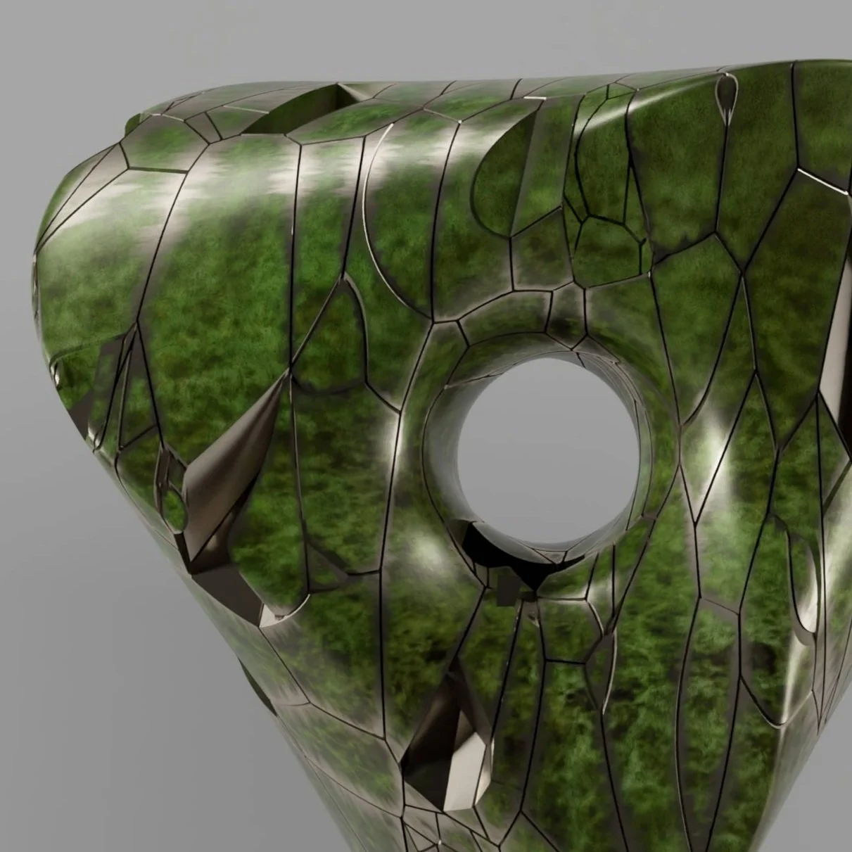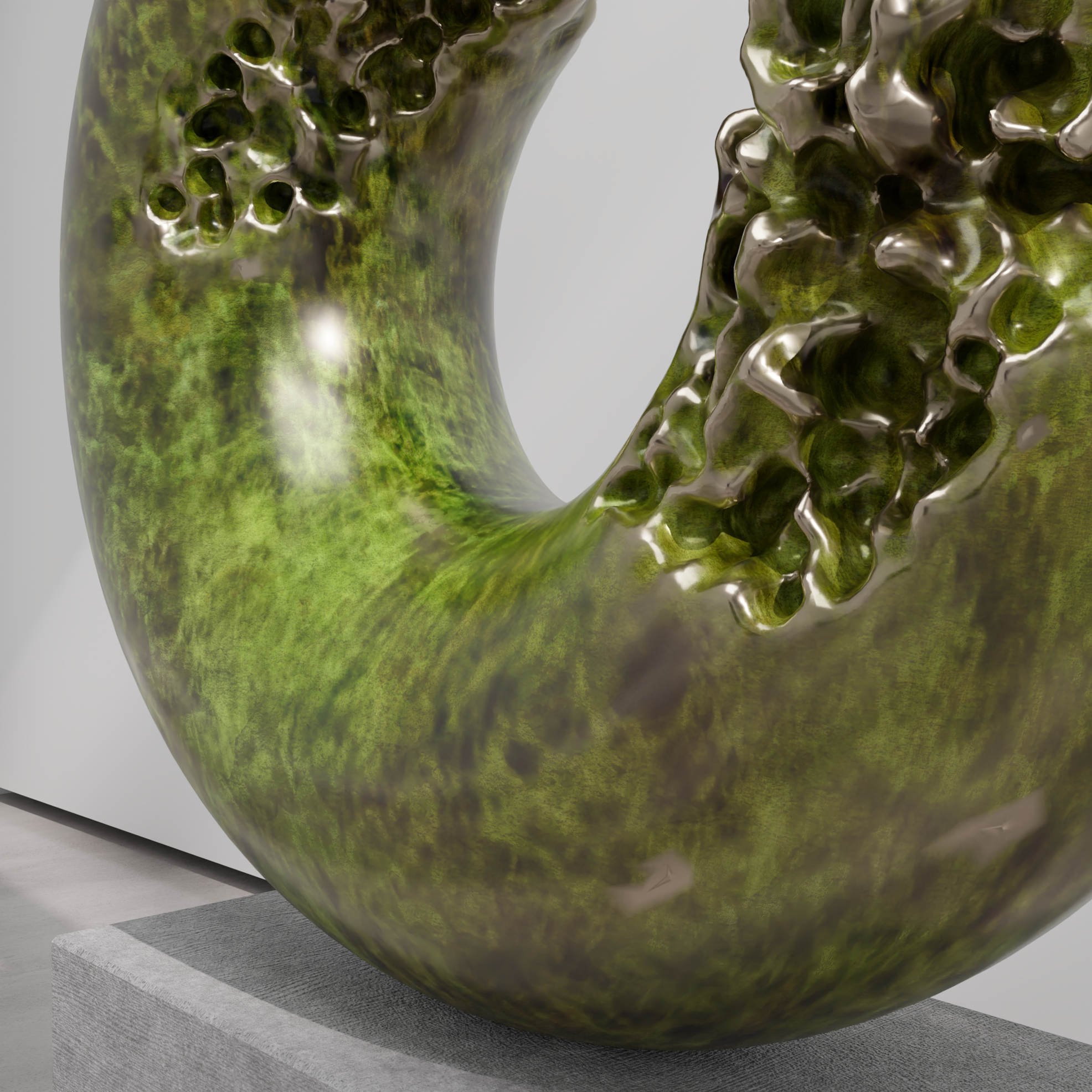 This patina and associated technique can produce a wide range of vibrant emerald green pattern with delicate detailing and a contrasting dark background. The primary colouring agent is genuine chromium oxide, which bonds strongly to bronze and maintains its stability and vibrancy even under high heat. Careful application ensures a balanced and layered effect, avoiding an overly opaque or solid appearance.