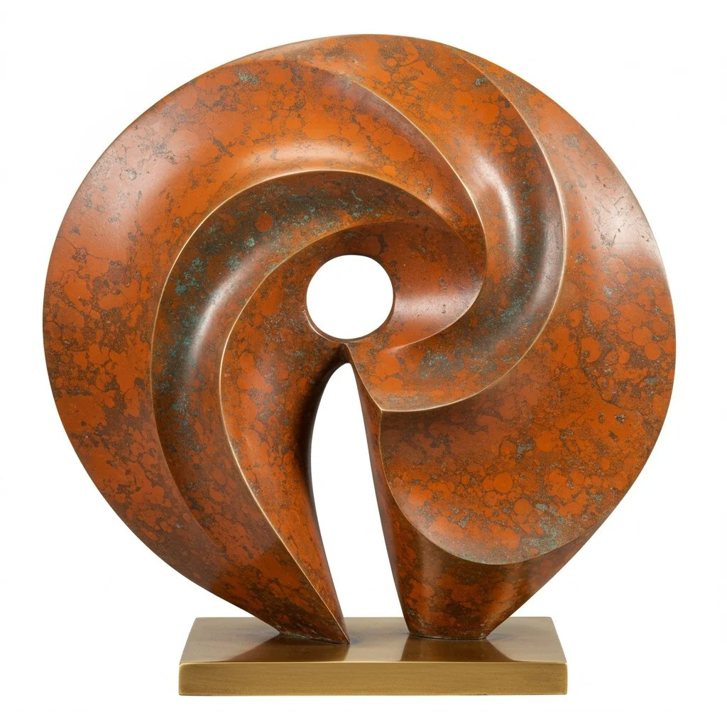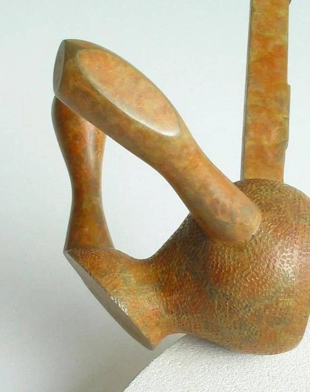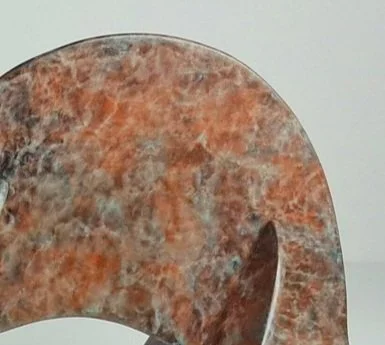 Beautiful stone like patina, with intense orange tones and a blue green speckle in the background. I have tried a range of orange pigments and have found that chromium orange pigment works incredibly well, it adheres very well to the bronze and doesn't seem to change its properties when heated. The key to this patination as with many patinas, is to be very subtle in the application of the main colour, the surface can easily become overloaded, leading to a dull opaque colour. This is a very diverse and stable patina, so is a great component to a transitional or compositional patina.